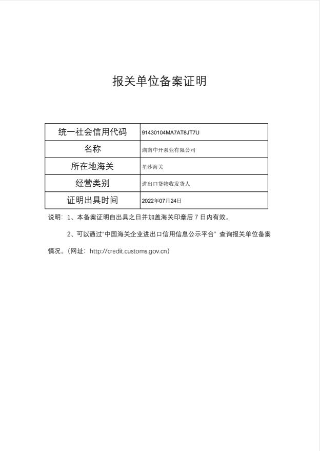 ZB中開泵業(yè)獲得報關單位備案證明